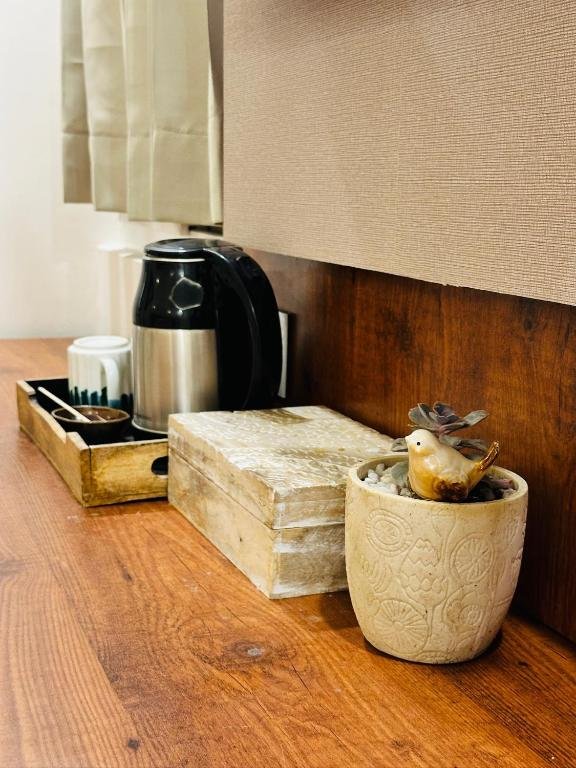 Enjoy freshly brewed organic coffee and soothing herbal teas.